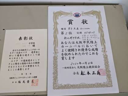 今朝は、男子バスケットボール部でブロックオールスター選出と陸上競技部で大阪市民カーニバル、リレーの部で第2位となった表彰でした。