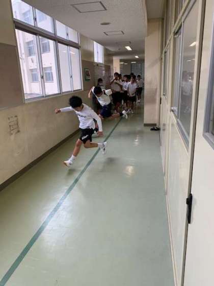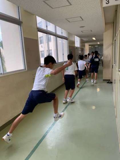本日、雨のため練習試合が中止になったので校舎内でトレーニングを行なっています。