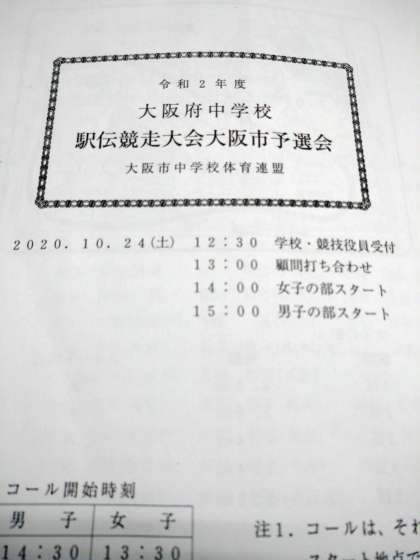 陸上競技部は10月24日土曜日に大阪府中学校駅伝競走大会大阪市予選会に参加しました!女子は竹村、加治屋、名倉、平奥、行田のメンバーで10位になりました!一年生の活躍が光りました!!男子のメンバーは峯松、児玉、吉田、梶山、巽、若松で25位でした。こちらも一年生が中心メンバーです!1月にも大阪市の駅伝があります。もう少し力をつけて来年は上位を目指したいと思っています。サポートのメンバーもよく頑張りました!お疲れさまでした。