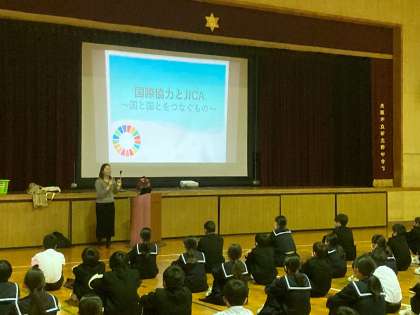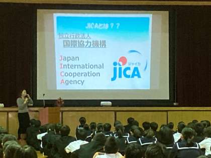 1年生では1限目、JICA(国際協力機構)の方に来ていただいて、国際協力について学んでいます。