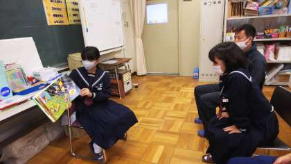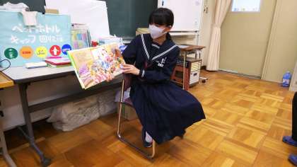 放課後のくすのきの部屋で、ボランティア部の生徒による読み聞かせが行われました。日頃の練習の成果を発揮すべく、大きな声で読んでくれました。
