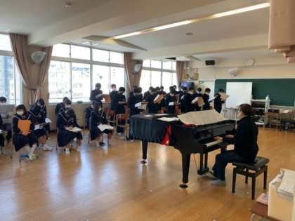 卒業式の合唱曲を練習しています。感染症予防のため、マスクを着用しての練習です。