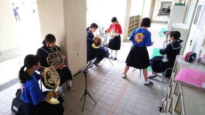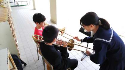 1年生に、4階で演奏を披露したあと、各楽器を体験してもらいました。最初はなかなか音が出ませんが、教えてもらううちに出るようになり、音階に挑戦している生徒もいました。