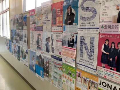 3年生のフロアには高校のポスターが貼られています。進路に向けて、いろいろな高校を調べてみましょう。