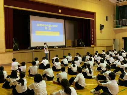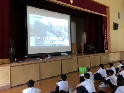 1年生は5時間目に体育館で平和学習をしています。オリンピックと戦争を題材にしたビデオを視聴しています。
