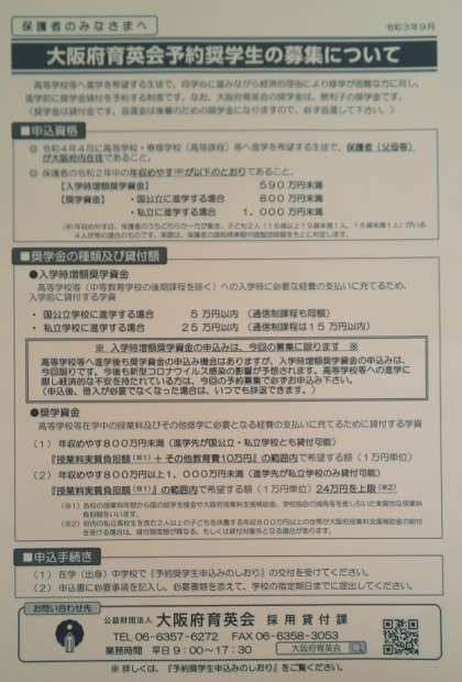 3年生 大阪府育英会のお知らせ