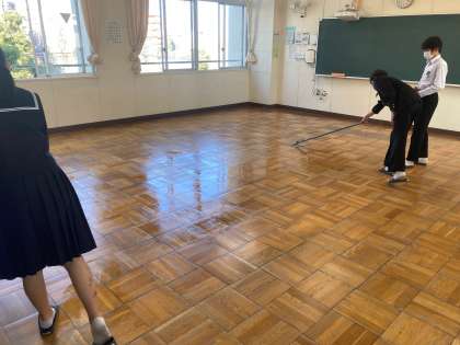 みんなが下校した後、美化委員・保健委員でワックスがけをしています。