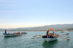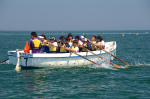 一泊移住 2日目午前 いざ出港です。 雲一つない青空の下、風は無風、海はなぎ状態。    ベストコンデぃションの中、船は泉州沖へ