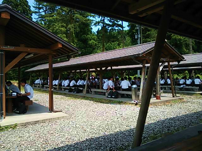 定刻1時に吉峯に到着、あまりにも良い天気なので、急きょ、屋根のあるバーベキュー場で昼食を食べています。このあと、入村式を行います。
