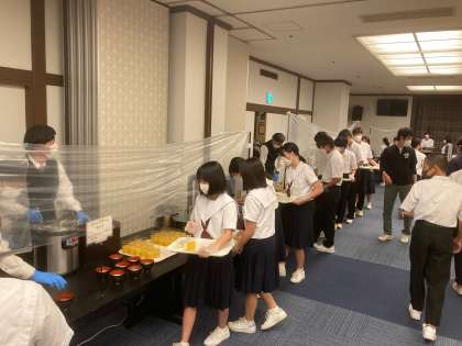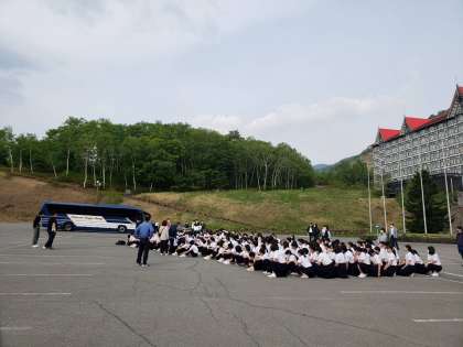 朝食のあと、ホテル前で全体集合写真を撮って出発です。
