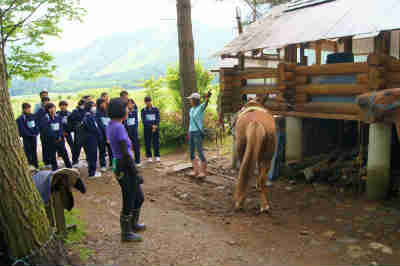 さあ、乗馬体験。説明を聞いているところです。馬は、かわいいですね。