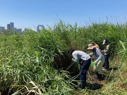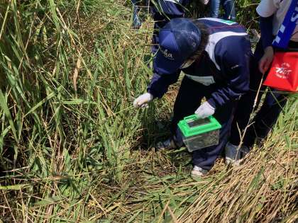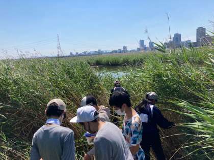 カニ釣りを通して、自然に親しみ、生き物とヨシ原の果たす役目に目を向けてほしいとの思いで、科学部の卒業生とその保護者の方(淀川自然観察会のスタッフをされていた方)が企画してくれました。