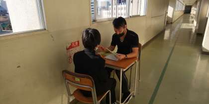 ポール先生と英会話のテストをしています。