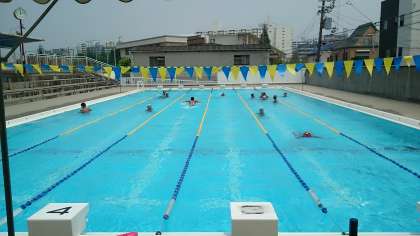 水泳部は、朝練と昼練の2部構成になっています。プールが戸外にあるため、みんな真っ黒に日焼けしています。顔には、ゴーグルの形がくっきりと浮かんでいます。それだけよく泳いだという証ですね。