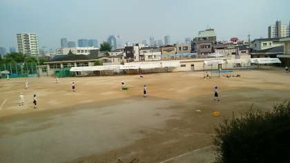 本当に暑い日が続いています。校内では、さまざまな部活動が行われています。運動部では、府の大会が終わり、次に向けて練習が始まっています。サッカー部は、この日1,2年生が試合のために他校に出かけています。その間、3年生は校内で練習に励んでいます。北中のグラウンドは、大阪市内でも広いほうですが、少し、形が歪になっていて、正式なサッカーコートが取れません(公式戦の会場にはなりません。残念です)。この日は、ミニサッカーのコートで練習を行っています。