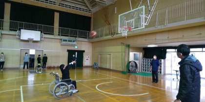 体育館で車いすに乗ってフリースローを
