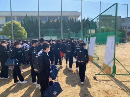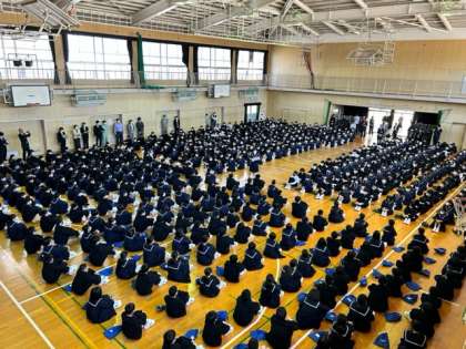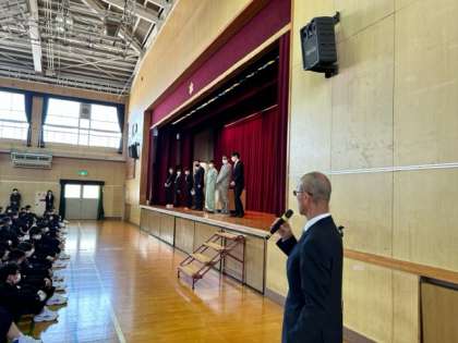 3年生のクラス発表の様子と、新転任の教職員の紹介、対面式の様子です。