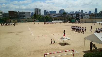 今日は一転して、良い天気になりました。2年生は、3,4時間目の総合の時間に学年練習を行っています。2年生の生徒と2年生の先生、体育科の先生の指導のもとで入場行進やラジオ体操の練習をしっかりと行っています。生徒たちの元気さ・若さが伝わってきます。