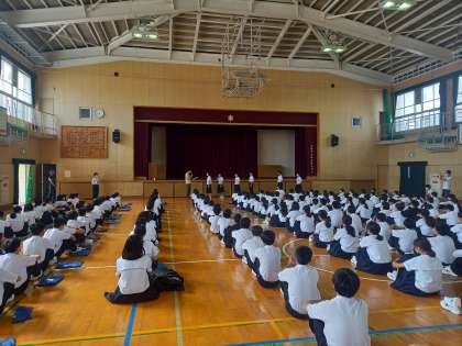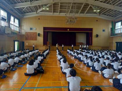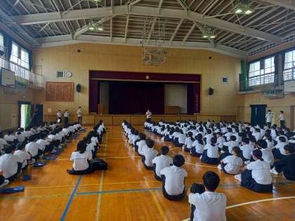 2年生は学年集会で一泊移住の室内オリンピック、大縄飛び、合唱選手権の表彰を行いました。