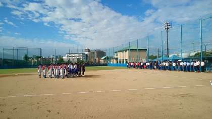 本日、市内各地で、運動部の秋季大会が行われます。本校から、ソフトボール部、バレーボール部、バドミントン部、陸上部が出場します。写真は、柴島グラウンドで行われるソフトボールの開会式です。みんながんばれ。