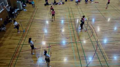 バドミントン部は、東成スポーツセンターで、団体戦が行われています。男子は残念ながら、敗れてしまいましたが、女子は決勝戦を戦っています。相手は、四天王寺中学校です。最後まで、全力でがんばれ!写真は、試合前の練習風景です。