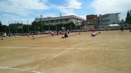 体育大会の予行を行っています。吹奏楽部の生演奏に合わせて行う入場行進、ラジオ体操とプログラムの順番に実施しています。写真は、ハードル走の様子です。