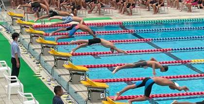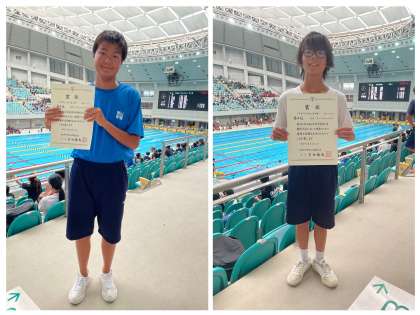 個人では1年生中尾さんが400mフリーで4位入賞、1年生畑井さんが100mフリーで8位入賞、団体では1年生メドレーリレーの部(畑井さん、中尾さん、稲見さん、上野さん)で決勝レースに進出し、惜しくも9位と入賞を逃しましたが、ベストタイムをだすことができました。また9月に行われるブロック大会に向けて頑張りましょう。
