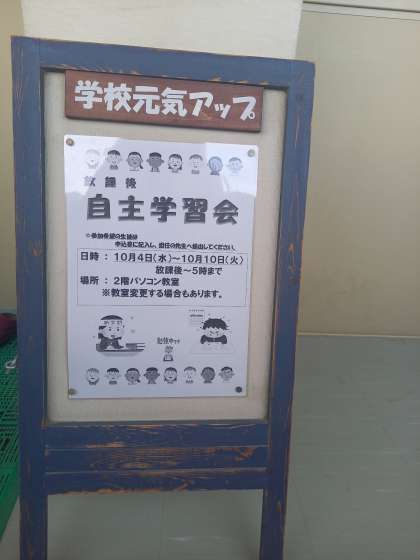 本日より中間テスト1週間前になりますので、学校元気アップ事業主催の放課後学習会がスタートしました。10月10日まで行いますので、ぜひ参加してください。
