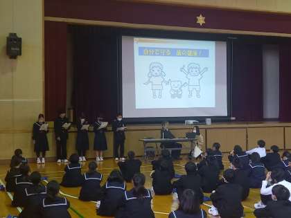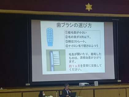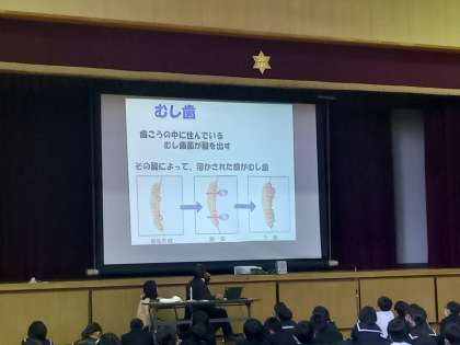 はじめに保健委員の皆さんよりアンケート結果の報告や実験結果、そして講師の先生よりむし歯のできかたや予防法、正しい歯磨きの方法などご指導いただきました。