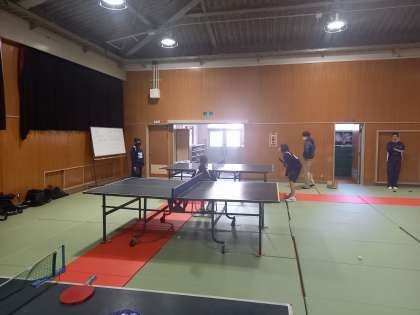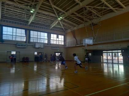 グランド改修工事のため、グランドは使用できませんが体育館や格技室で部活動も頑張っています。体育館は3分割して練習します。