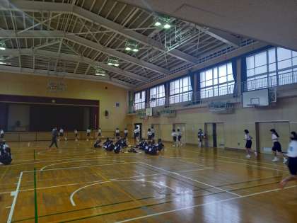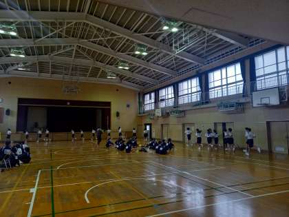 マラソン大会に向けての練習です。グランドが使えないため、体育館で時間走です。