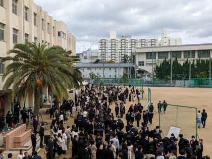 グランドで保護者の皆さんと記念写真。緊張がとけリラックスした表情です。