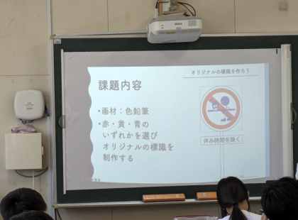 4時間目、教育実習生による研究授業です。2年生、美術科です。本日の学習は、「オリジナルの標識を作ろう」です。