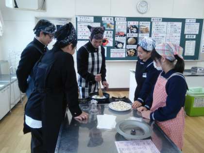 3年生は、家庭科の時間に調理実習を行っています。キャラメルポップコーンを作っています。エプロンを身につけ、三角巾を頭に巻き、とっても調理にふさわしい姿ですね。なかなか、おいしく出来上がっていました。