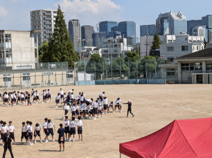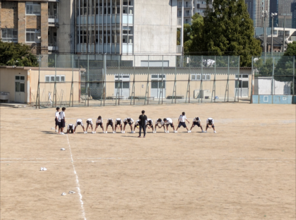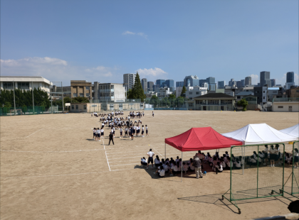 5時間目、1年生の体育大会学年練習です。各クラス、作戦を立てて練習に取り組んでいます。