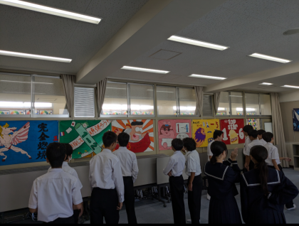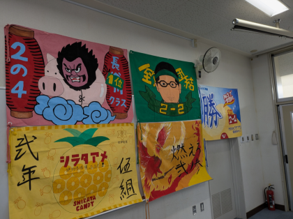 体育大会に向けて制作した各クラスの学級旗の展示です。