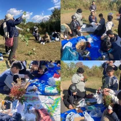 マルバシャリンバイや松ぼっくりを一つにまとめて、