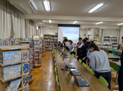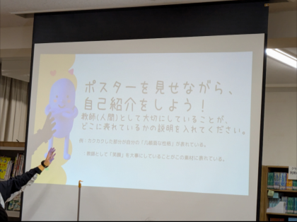 グループごとに自己紹介したあと、全員の作成したポスターを見ています。