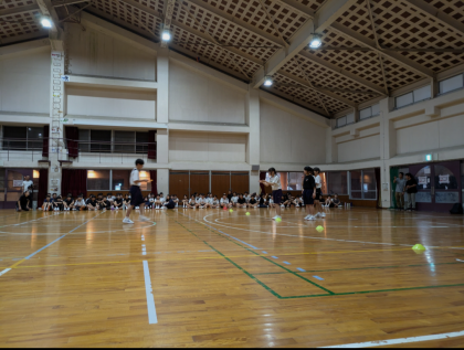 次の種目は、ピンポン玉リレーです。体育委員の見本です。