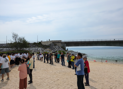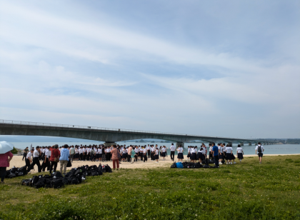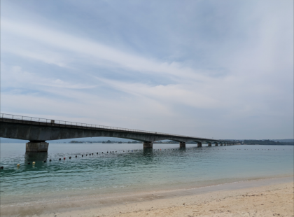 古宇利大橋で全員の写真撮影です。お世話になった民家の皆さんも一緒です。素晴らしい景色です。