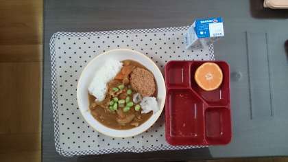 本日の給食は、人気メニューの一つである『チキンカレーライス』です。おかずは、ミンチカツ、だいこんのサラダ、枝豆、みかんです。