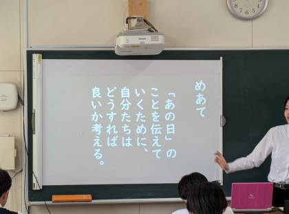 単元名は、「壁に残された伝言」です。本時のめあては、「あの日」のことを伝えていくために、自分たちはどうすれば良いか考える。です。
