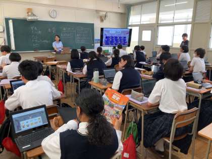 授業の最後には、Kahoot!というアプリを使って、クイズ形式で復習しました。生徒たちはとても楽しそうでした。