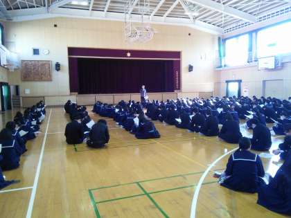 2月8日(月)の第6時限目に、3年生は体育館で『私立高校入学試験の事前指導』が行われました。進路指導主事の細川先生から、配布したプリントを基に、諸注意がありました。具体的に「受験票を忘れないように」「遅刻しないように」「余裕をもって行動するように」といったお話がありました。お話の雰囲気として、「今まで頑張ってきたことを精一杯発揮してもらいたい」という、深い願いが込められていました。