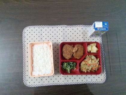 2月9日(火)の給食のおかずは、おろしとんかつ、ツナと野菜の炒めもの、水菜とはくさいの煮びたし、パインアップル缶詰でした。