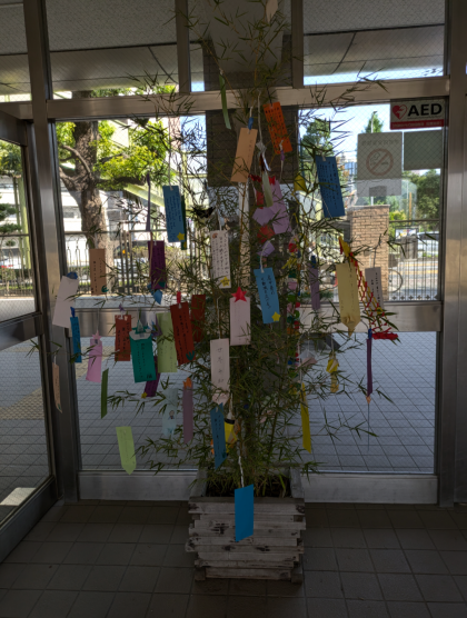 本日は七夕です。ボランティア部の皆さんが玄関に七夕の飾りつけをしてくれました。短冊には様々な願い事が書かれています。かなうように毎日の生活を充実したものにしましょう。
