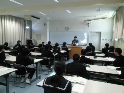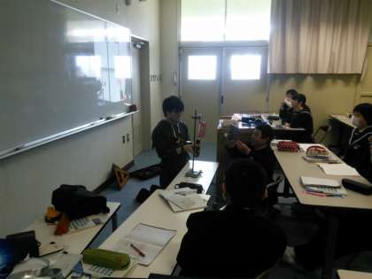 1年生の数学の授業で、おもしろい取組みが行われましたので、ご紹介します。回転体の項目で、「三角形、半円等を回転させたときにどのような図形ができるか」という疑問に理科のような、技術科のような見せる授業を行いました。理科で使うスタンドと技術科で使う電動ドリルを活用し、三角形や半円等の図形を回転させました。すると三角錐や球が鮮やかに現われ、生徒たちは、「すごい」と、感動していました。