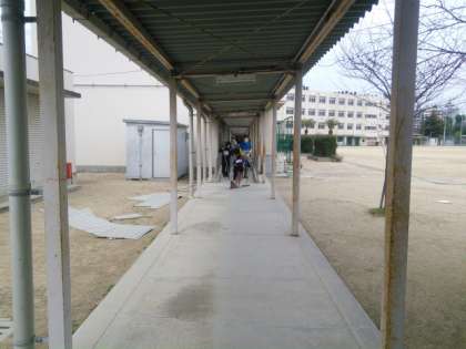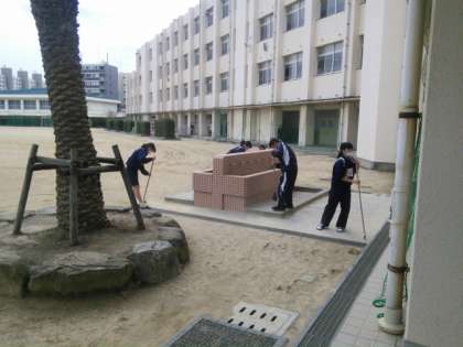 1年生は、会場となる体育館周辺と正門・廊下の清掃を中心に行っています。みんな気持ちを込めて掃いたり拭いたりしています。みるみるうちに美しくなっていきます。教職員も一緒に活動しています。生徒も教職員も一緒になって、明日の式が気持ちよく行えるように汗をかいています。