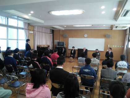 PTA会長植田様のごあいさつののち、校長より、転任・退職者の照会を行いました。花束贈呈後に、各教職員が離任の挨拶を行いました。