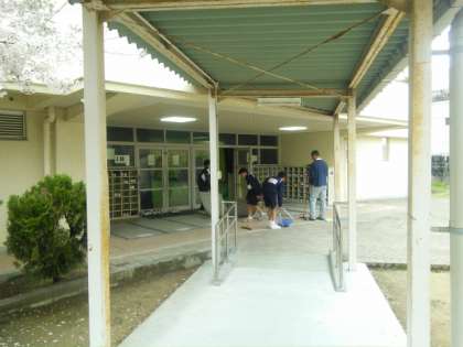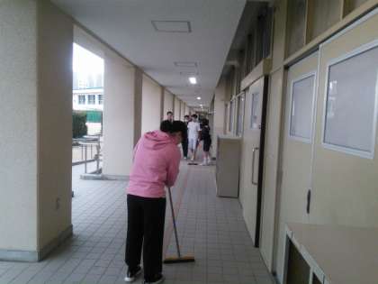 明日は、本校72期生の入学式です。大きな学校行事ということで、教職員も生徒も一生懸命準備に励んでいます。廊下の清掃や会場となる体育館も、まずは、掃くことから始まります。先生も一杯汗をかいています。